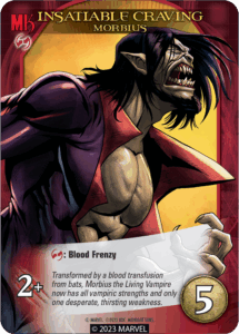 The powerful effects of their craving fuel this all-new keyword, which can be found on both Heroes and Villains. In both cases, Blood Frenzy means “You get +1