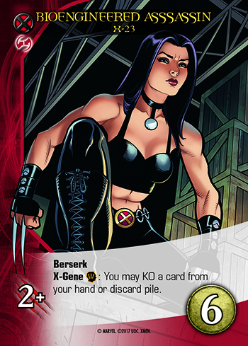 X-Gene is all about the X-Men combining unique mutant powers with their signature teamwork. X-Gene looks for a specific type of card in a player’s discard pile. Kitty Pride’s card above is looking for an X-Men team affiliated card in that player’s discard pile. If there is one, that player can draw a card.