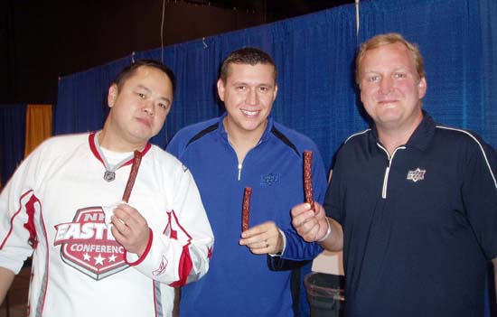#2 – Pulling the Winning Ticket – One of the most important reasons for this trip for Upper Deck is to be able to give back and thank all the customers who have been supporting our product lines all season long. We do that by having a daily raffle where we give away a variety of great items to fans in attendance. And wouldn’t you know it, I get to be the guy that pulls the winning ticket from the bowl. It is so much fun to slowly read the numbers, watch the anticipation in people’s eyes and then draw the winner. Check out this video where a fan goes crazy after winning a tin of UD’s ultra-premium product, The Cup: http://www.facebook.com/pages/Upper-Deck-Entertainment/147393155320725?ref=ts#!/video/video.php?v=462503997122