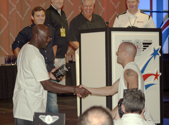 I have been working with Upper Deck since 1997 and in that time I have been privileged to know a great many passionate sports fans. Being a sports fan myself, I know I’ll never be able to throw a precision pass like Peyton Manning; hit a curve ball like Ken Griffey Jr.; fire a slap shot like Steven Stamkos; or hit a clutch jumper like Michael Jordan. Or could I? Jordan has been offering adult basketball fans the chance to come fly with him at a camp he runs in Las Vegas each year. The MJ Flight School just finished its 14th annual camp and it’s safe to say that MJ left an indelible mark on those in attendance.