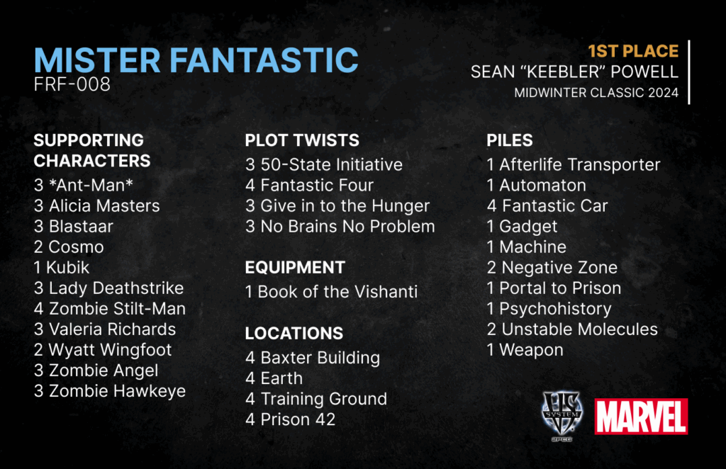 Sean “Keebler” Powell was one of many Zombie enjoyers and managed to fit 10 copies of them into his winning list. A couple of the standout picks were Zombie Stilt-Man (14 XP for Mister Fantastic on Turn 1!) and Zombie Hawkeye.