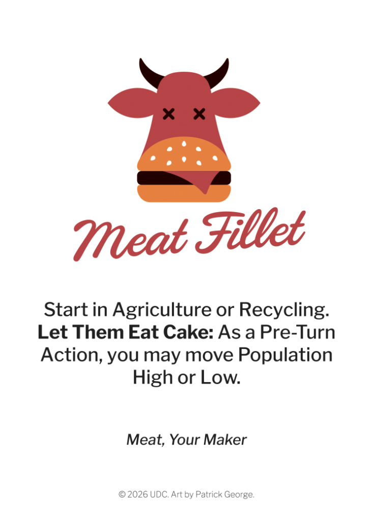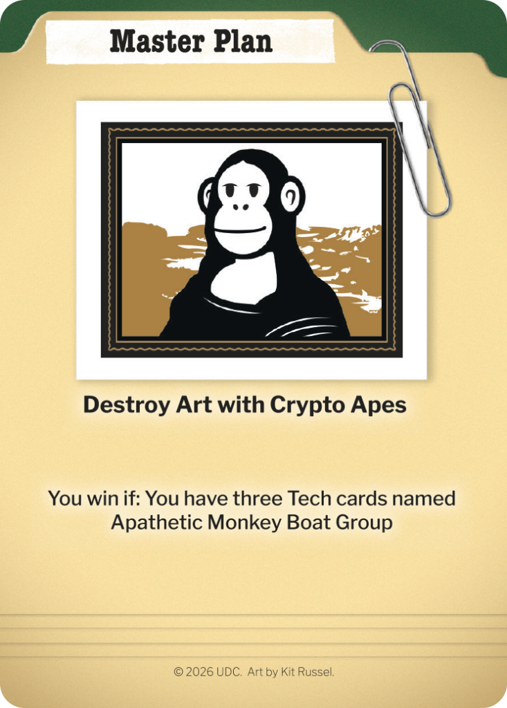 Bring about your evil schemes by launching one of twenty-two ways of destroying the world. Secret win conditions (with a backup win condition) mean even if the other players try to stop you, you may still have a path to victory.