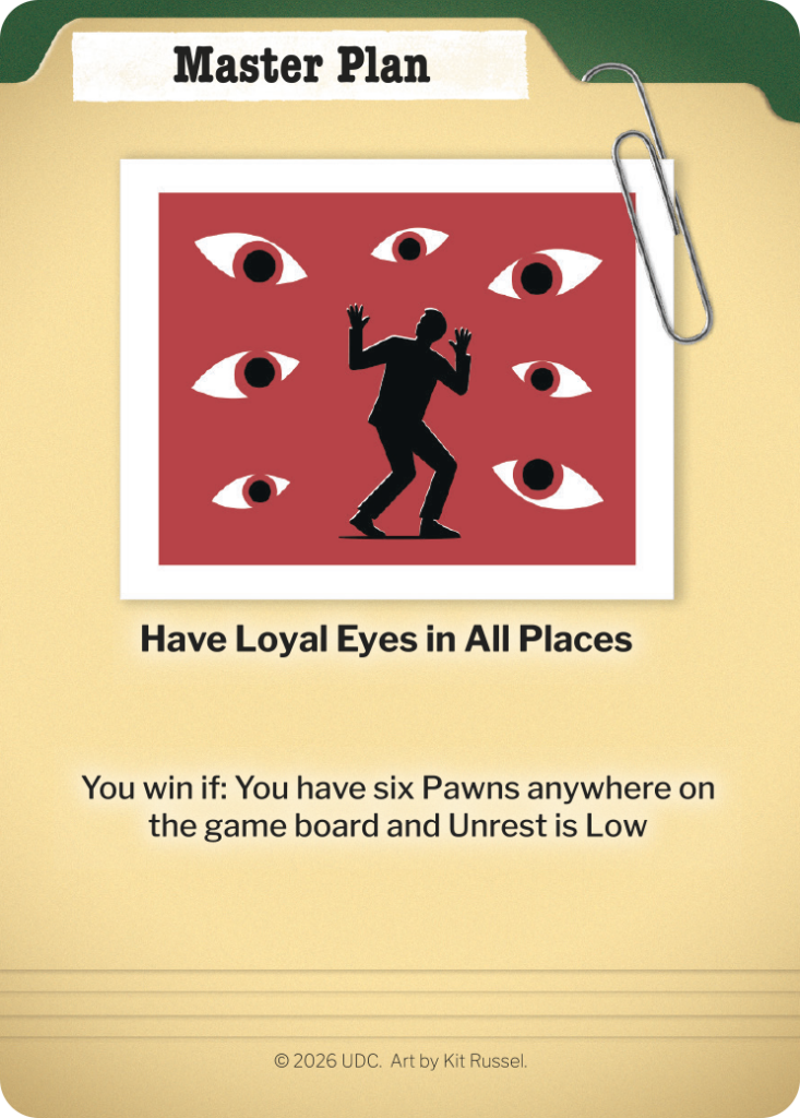 Your secret win condition. Each Master Plan requires specific global track positions to activate, and you get two to choose from. If your first plan gets blocked, you always have a backup.