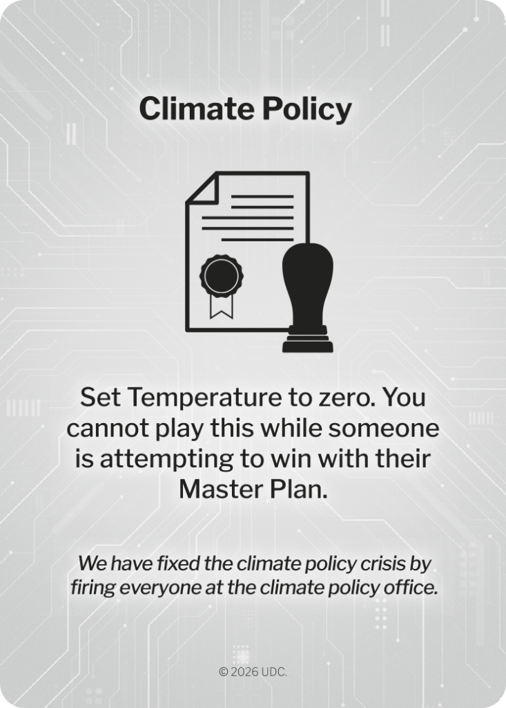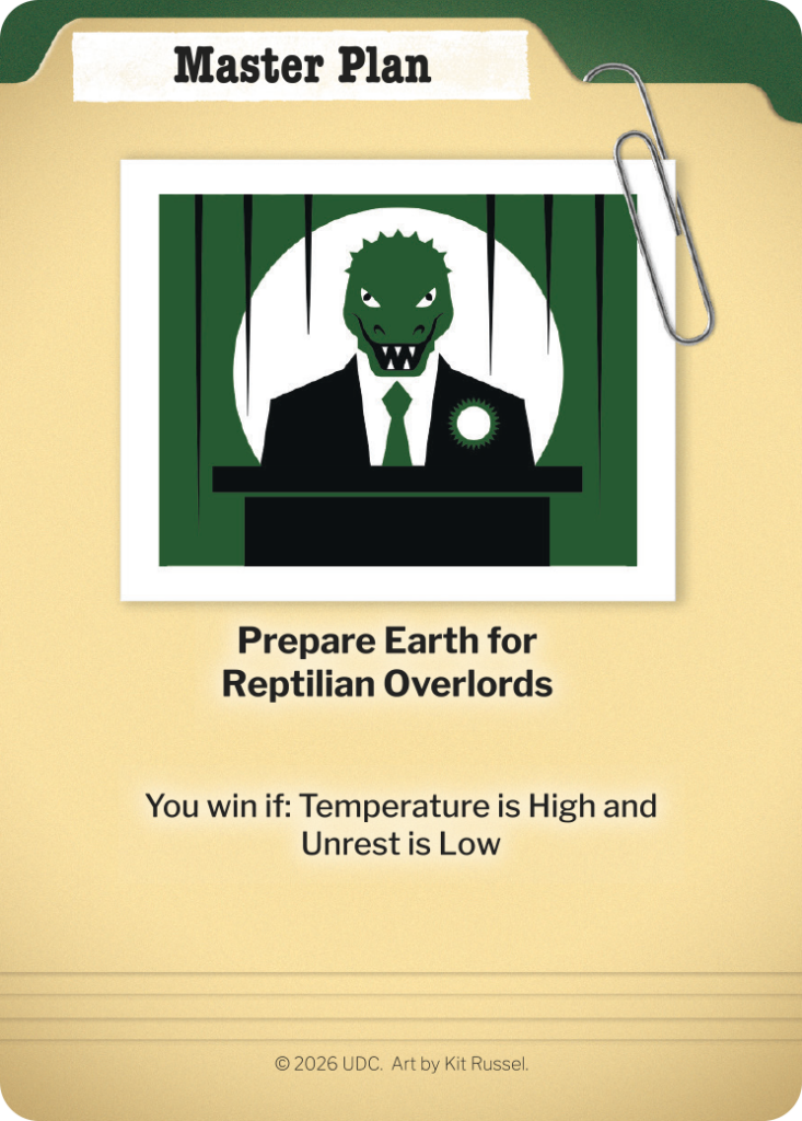 Ensure they don’t succeed by destabilizing the world’s temperature, population, and unrest, placing pawns in key industries of power, and making deals with other players to stay on top.