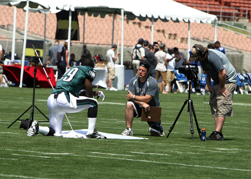 LeSean McCoy (Eagles) being interviewed by Terry MeliaJosh Freeman (Buccaneers) getting ready to do his touchdown celebrationMike Wallace (Steelers) chatting with Gabriel Garcia Stephen McGee (Cowboys) being taped doing his touchdown celebrationJosh Freeman (Buccaneers) doing his touchdown celebration.Michael Crabtree being shot by John Grieshop at the Porta-PitNate Davis & Kyle Tolle (waterboy) playing catch.