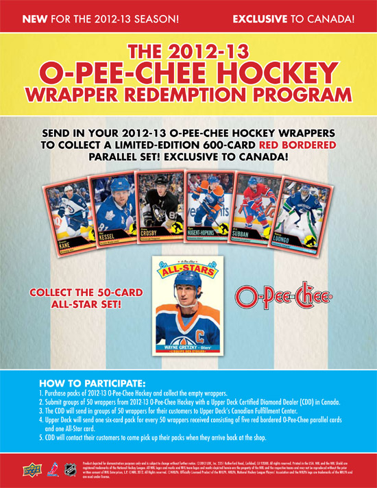 If you live in Canada and are planning to open HOBBY packs of 2012-13 NHL O-Pee-Chee when it releases on August 14, Upper Deck has an exciting promotion you will certainly want to be a part of. Canadian collectors are invited to collect an extremely limited set of 2012-13 NHL O-Pee-Chee just for purchasing their product through an Upper Deck Certified Diamond Dealer in Canada. A special red-bordered version of the entire 600-card set and a unique 50-card All-Star set will be available for collectors to claim through a wrapper redemption program. Here is how it works: