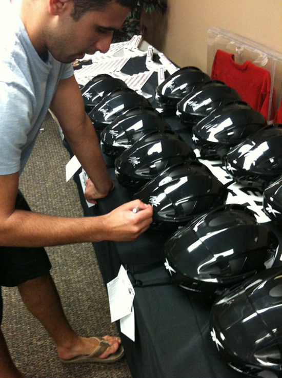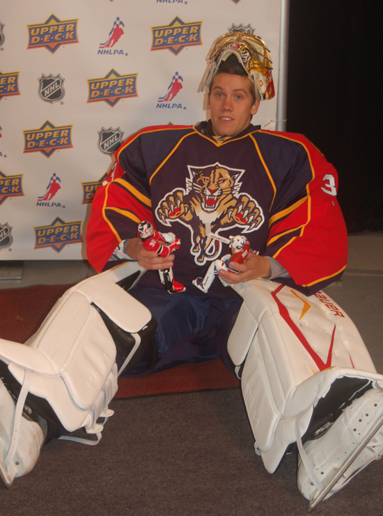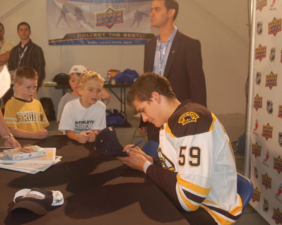 On the upper level of the MasterCard Centre, situated inside the NHL Alumni Office, Upper Deck’s Drew Mills and Jeff Lowman shuffled the players through a well-orchestrated memorabilia signing station that had each of them autographing items ranging from pucks and mini-sticks to helmets and photo mats. They also tried on a variety of authentic NHL jerseys from their respective teams that will be utilized in upcoming Upper Deck hockey card products as event-worn jersey memorabilia cards. Upper Deck’s 2010-11 Series One Hockey set, which is scheduled to launch in mid-November, will be the first product to include cards of this year’s rookie crop, provided the players compete on Opening Night.