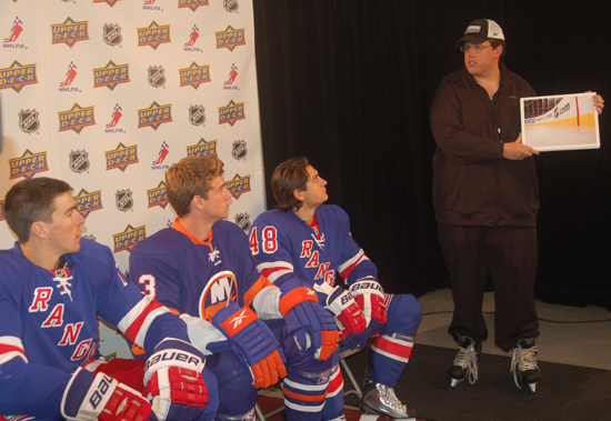 Positioned beside the still/portrait photography station, led by Bob Marsolini, was Upper Deck’s video crew setup, which was being spearheaded by Terry Melia and Chris Carlin. Similar to last year’s “Upper Deck Rookie Boot Camp” setting, Melia and Carlin put the players through a variety of well-thought-out skits that included a marriage proposal by Florida Panthers goaltender Jacob Markstrom; a “man-crush” encounter between Carolina forward Jeff Skinner and an overzealous fan; and a multi-tiered media training vignette that had many of the players throwing Edmonton Oilers forward Jordan Eberle under the proverbial bus, which is considered a big “no-no” during media interviews if locker rooms are to remain somewhat harmonious. In addition, Carlin asked each of the players a multitude of questions that were supplied by Upper Deck’s loyal Facebook followers. Check out Carlin’s latest UD Blog entry here: https://upperdeck.com/2010/09/the-2010-11-nhl-rookie-class-answers-your-questions/.