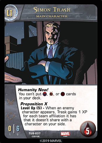 Note: Proposition X works like this: When an enemy character appears, check each of its team affiliations against each team affiliation on characters on your side. For each affiliation the enemy character has that is NOT shared, Trask gains 1 XP.