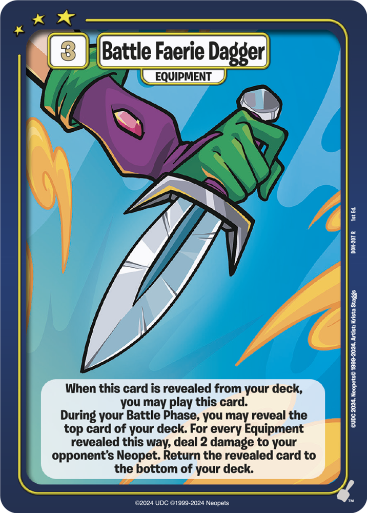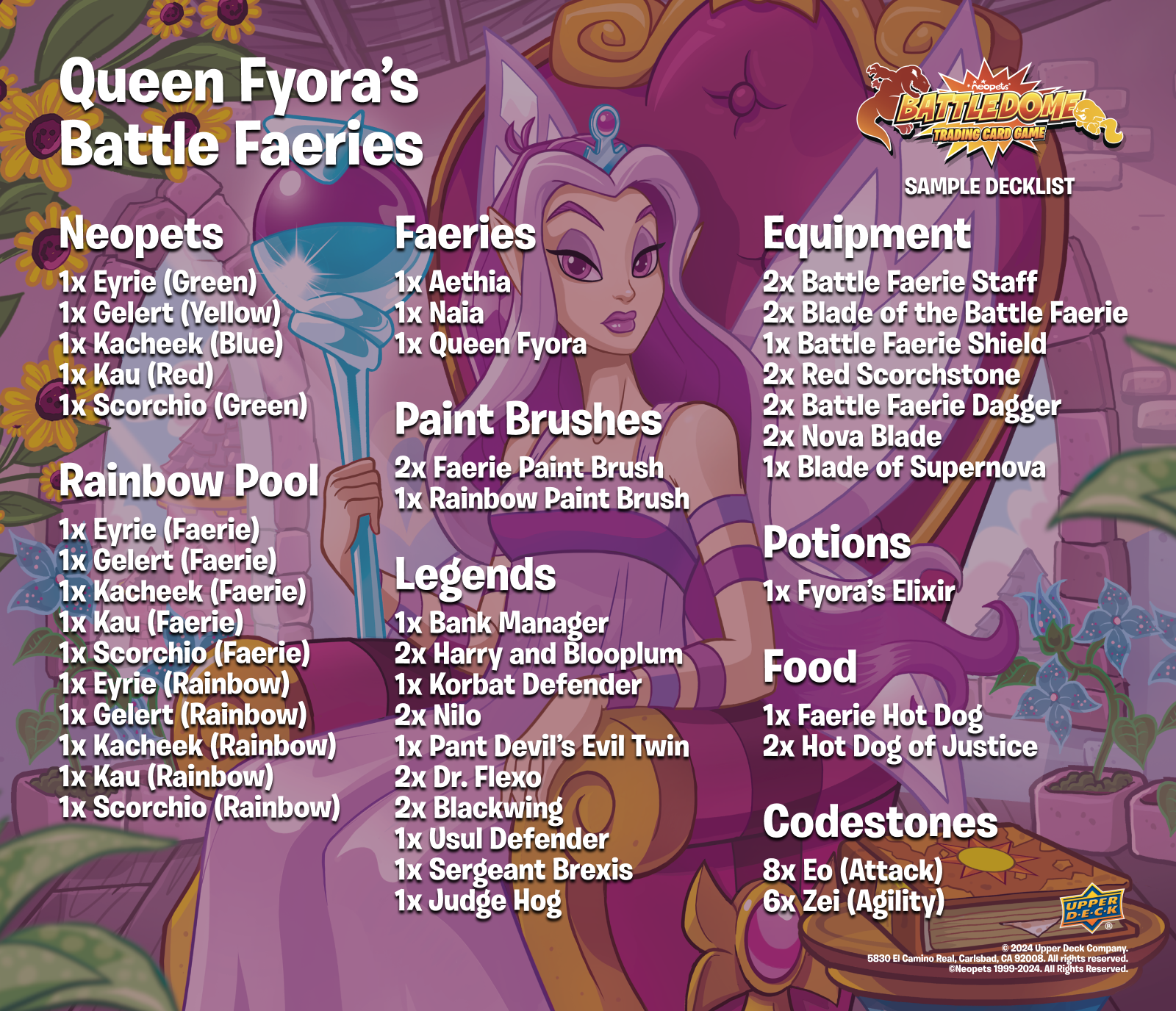 The main goal of the Queen Fyora’s Battle Faeries deck is to set up a powerful engine of continuous unblockable damage and strong attacks using Faerie Neopets, Queen Fyora, Battle Faerie Equipment, and Legends that reveal cards from your deck. With these pieces combined, you can string together a fierce combo of cards that is likely to present a formidable threat to your opponent! Here are some key cards you will want to be familiar with when building this deck:
