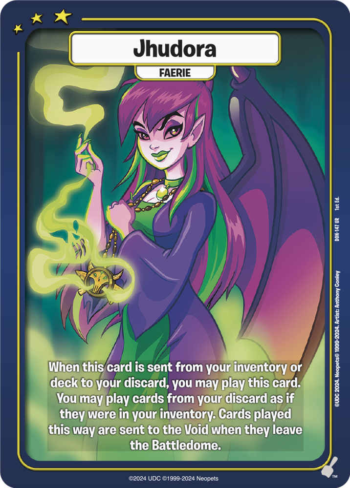 The main goal of the Jhudora’s Aggressive Ghosts deck is to create a consistent engine of cards like Jhudora, Ghost Neopets, Jhudora’s Equipment, and Legends that send cards to your discard. This suite of options allows you to play multiple cards in a turn and create an armory of powerful equipment. The added bonus of Jhudora’s ability to recur cards from your discard lets you implore this goal over multiple rounds as well. Here are some key cards you will want to be familiar with for this deck: