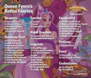 In the Defenders of Neopia base set, you will find a handful of cards with the words “Battle Faerie” on them. These cards synergize strongly with other cards like Queen Fyora and Blackwing that reveal cards from your deck. All of the Battle Faerie cards have an alternate way to play them and can create some powerful chains during gameplay. Bobby put together an awesome sample decklist for you. Check it out: