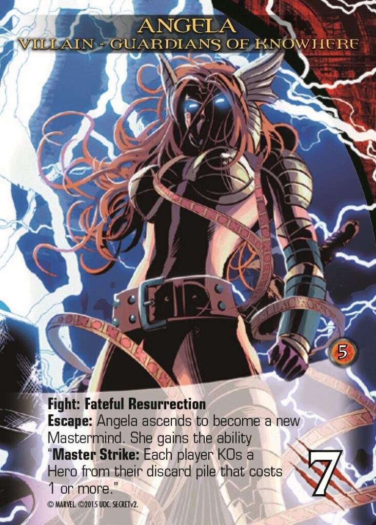 Also, the “ascends to become a new Mastermind” effect was so much fun in Secret Wars – Volume 1 that we brought it back for Volume 2! Be warned, for if you cannot defeat Angela (who is a handful already at 7 Attack even without Fateful Resurrection), she will escape and ascend to become a Mastermind with a pretty filthy Master Strike ability, potentially KOing your best cards! If she comes up in the early game, it may spell trouble for our heroes!