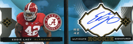 This week Upper Deck released 2013 Ultimate Collection Football, a super-premium gridiron release featuring rookie stars and legendary players. And so far it seems to be a hit. Take for example what happened at Nick’s Sports Cards in Dallas, Texas. Debbie Redwine at the shop shared with Upper Deck via email, “I sold three packs to a customer who proceeded to buy every pack in the case and LOVED it! He pulled an Eddie Lacy one-of-one booklet autograph rookie card! You guys are hitting home runs on all of your products as of late and we couldn’t be happier for our customers!”