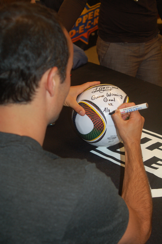 But before the actual autograph signing session took place, we asked Landon a few questions on camera about his newfound relationship with UDA; the most memorable moments thus far in his illustrious career; and a few zingers about the art of signing autographs and what were some of the more unusual items he’s ever been asked to sign. The 29-year-old winger/striker for the Galaxy was relaxed, tanned and more than willing to provide well-thought-out answers to each our questions. He even took time to describe in detail the moments stemming from some of the pieces he was about to sign including a FIFA World Cup soccer ball, a 16″ x 20″ “Corner Kick” photo, and another 16″ x 20″ photo entitled “Colors of the Game.” We couldn’t have asked for a more personable spokesman; he provided unique answers and smiled throughout much of the interview.