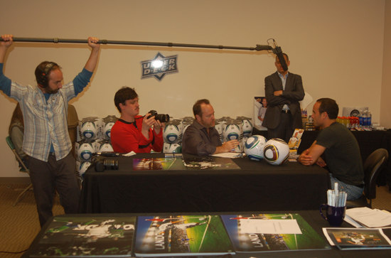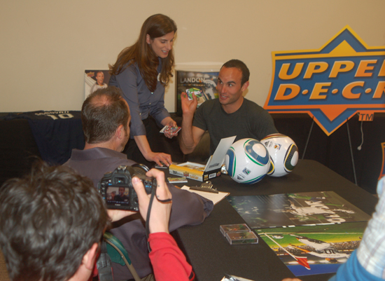 The pictures below show some of the moments captured throughout the two-hour meeting. And while the photos illustrate some of the day’s activities, the forthcoming video footage will surely entertain and inspire everyone who sees it. Did you know Landon stands just 5′ 8″ tall? Did you know he used to wear uniform No. 21? Did you know there are several different scenarios that can play out with every corner kick he launches? Stay tuned; we should have the exclusive Landon Donovan UDA interview video ready for sharing next week. Until then, enjoy the pics. And don’t forget to peruse the collection of freshly inked Landon Donovan memorabilia available only at the Upper Deck online store!