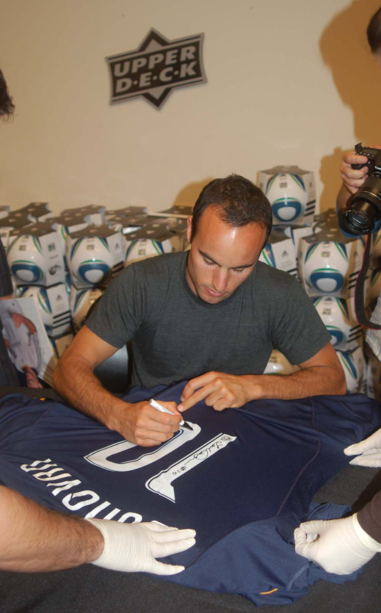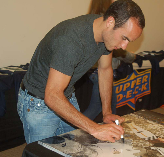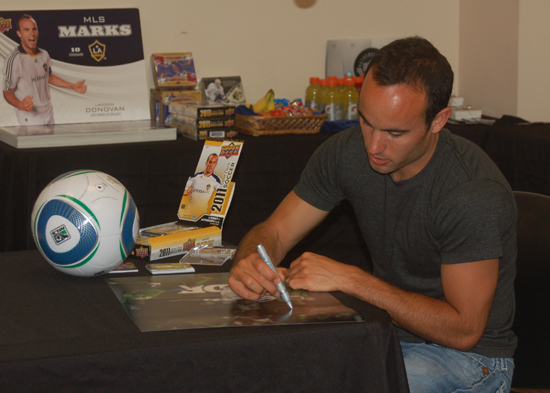 L.A. Galaxy superstar Landon Donovan conducted his very first autograph-signing session with Upper Deck Authenticated (UDA) earlier today. And the seven-time winner of the U.S. Soccer Player of the Year award couldn’t have been more accommodating. Once he walked into the interview/signing area, he played the role of consummate team player. He introduced himself by greeting everybody in the room with a solid handshake and once the pleasantries were over, he sat down to conduct business. As UDA’s newest exclusive signer (multi-year deal), Donovan was anxious to get rolling with his latest assignment.