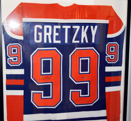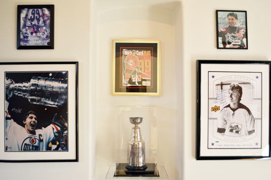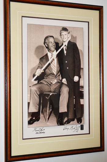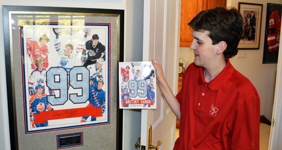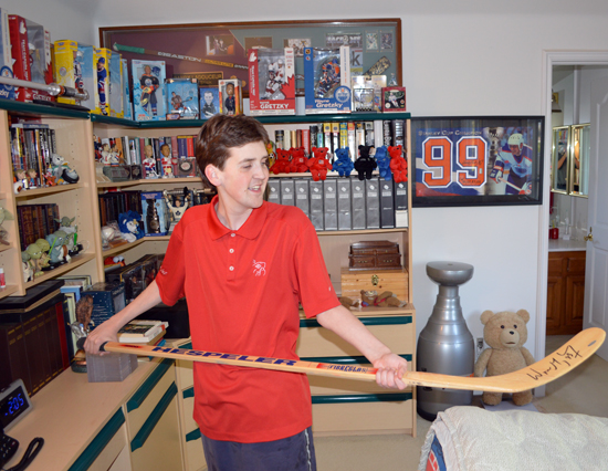 Jeffrey holds one of his many Gretzky signed sticks in one of the rooms of his house dedicated to “The Great One.”
