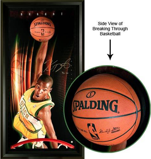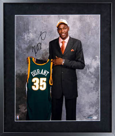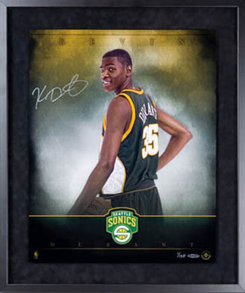 Some collectors like to collect signed copies of Sports Illustrated and those can be a good investment. Again, you just need to make sure they are authentic and come with a legitimate certificate of authenticity. Here's one from Nick Collison when he graced the cover.Show everyone you were a fan of the "Durantula" from the get go with his rookie draft day signed photo!There are plenty of collectibles of Durant in his OKC gear, but the Sonics memorabilia is drying up for sure. This Upper Deck Authenticated Collectible can be tough to come by these days.Every Thunder fan needs a Kevin Durant signed basketball. UDA produced a variety during his rookie season with different inscriptions like this one touting him as the 2007 NCAA Player of the Year!One of the coolest collectibles in the market comes from UDA and it is the Breaking Through display where the basketball comes through the glass. Kevin Durant signed a limited amount of these his rookie season and they are just awesome!