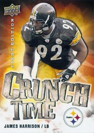 Heck, last season even we got in on it. Upper Deck had an insert set called “Crunch Time” featuring players like Harrison who are known to deliver the type of huge tackles that get fans fired up. We were giving fans what we believed they wanted and the insert set was approved by the NFL.