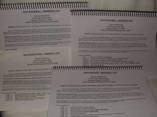 If you really want to get into the hobby of collecting autographs through the mail, Harvey Meiselman writes a comprehensive book every year, with the players’ home addresses. It is so great to use and you get the address for almost every current and retired player. Here’s more information about Harvey’s book: http://www.sportsaddresslists.com/.