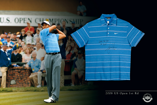 Looking for the ultimate high-roller gift for Father’s Day? During a recent trip to Orlando for the previously blogged about Swing With Tiger event, we stopped by Tiger’s office to have him sign and inscribe the shirts he wore in the first three rounds of last year’s U.S. Open. The shirts are available for sale on www.UpperDeckStore.com for $30, $40k, and $50k respectively. Wondering what happened to the red shirt Tiger wore on Sunday and the next day in the 19-hole playoff against Rocco? Sorry, you won’t get your hands on that one. It remains in Tiger’s personal collection and I’m sure one day it will be displayed in the World Golf Hall of Fame, celebrating what many have called Tiger’s greatest victory ever.