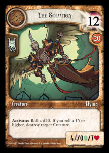 On your turn, you will lose all unstored Casting Points, ready all your cards, then draw a card. Then, you’ll make a choice – do you want to Attack or Cast? If you choose Cast, you’ll roll a d20 and gain that many Casting Points to use to play cards from your hand. There are five types of cards you can cast in this way; Magic, Instant, Creature, Enhancement, and Relic. But you need something else to play a card! Each Starter Pack comes with two playmats, and the playmat is more than something to help you organize, the spots on the playmat contain intrinsic rules about what you can play.