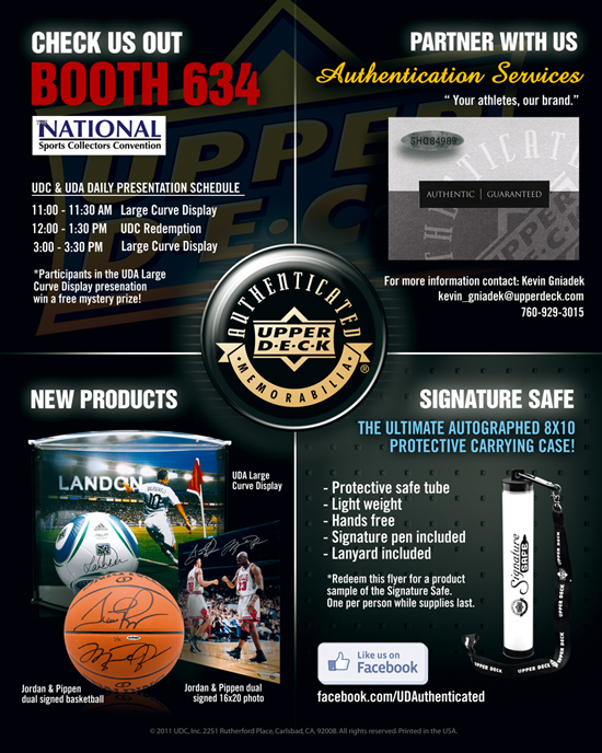 It’s no secret that I thoroughly enjoy attending the National Sports Collectors Convention. And this year Upper Deck is pulling out all the stops to make it an extremely memorable event for our fans in attendance at the Donald E. Stevens Convention Center in Rosemont, Illinois from August 3-7, 2011. Upper Deck will have plenty of on-site promotions taking place at the company’s corporate booth (# 634) to excite the tens of thousands of collectors in attendance.