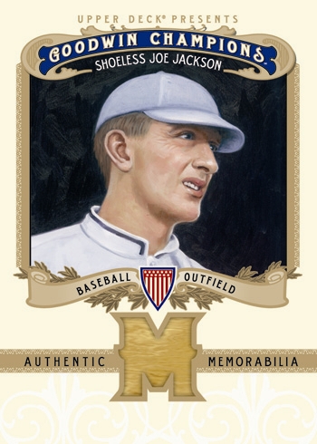 Upper Deck was able to procure an authentic game-used bat from Shoeless Joe Jackson that he used during his barnstorming days in the mid 1920’s. A portion of this historic piece of lumber was used to create a limited run of two separate cards (a single swatch and a very rare multi-swatch variation) within 2012 Goodwin Champions. These truly historic artifacts will be inserted randomly into packs for collectors to find when the product releases on August 14. This marks the first time since 2001 SP Legendary Cuts that Upper Deck will include game-used bat cards of Shoeless Joe Jackson in a trading card release.