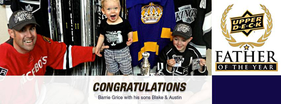 “I’m nominating my husband Barrie Grice for this year’s Upper Deck Father of the Year because of the passion he shows as the father to our boys, something that transcends the hobby and is more valuable than any collectible. Barrie has been involved in the hobby for over 30 years and now has shared his love of sports, the hobby and collecting Upper Deck cards to our two young sons, Austin (8) and Blake (1).