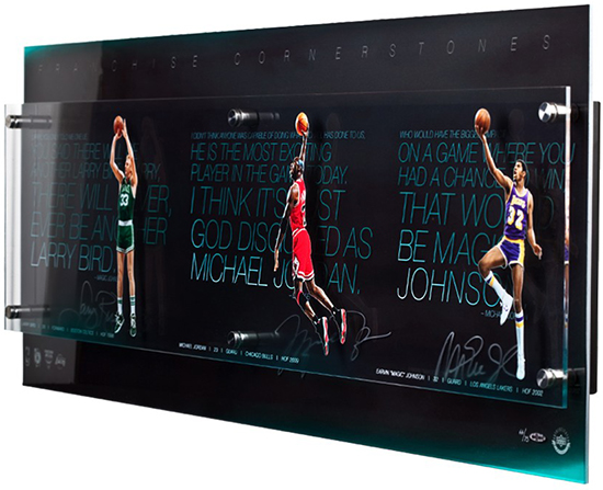 First up is the “Franchise Cornerstone” display featuring autographs of Magic Johnson, Larry Bird and Michael Jordan on a 48”x18” multilayered acrylic display. Behind the player’s image is a quote from the players talking about each other along with stats from their career. These “Dream Team” members seldom sign together and this is a piece you have to see in person to appreciate.