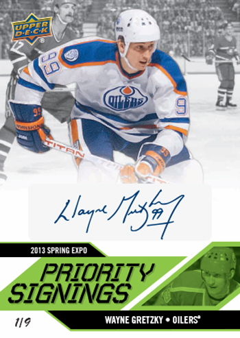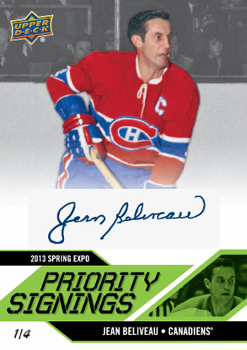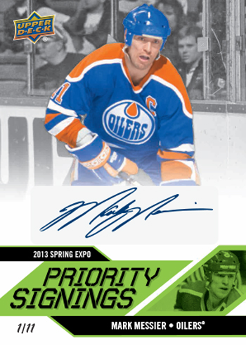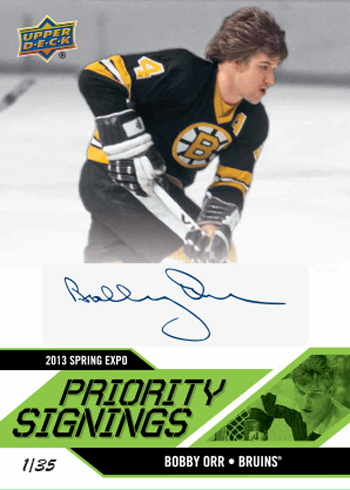The Priority Signing wrapper redemption program is back where fans in attendance who purchase a hobby box of 2012-13 NHL Artifacts, 2012-13 NHL Upper Deck Series One, 2012-13 NHL Black Diamond or mini box of 2012-13 NHL Fleer Retro from a Certified Diamond Dealer at the show will receive a voucher. They can bring that voucher to the Upper Deck booth at specified times where they can exchange it, along with the wrappers from the box for a random 2013 NHL Priority Signings Autograph card for FREE! And for the first time ever, all the cards in the Priority Signings set will be limited to just 35 copies or less!