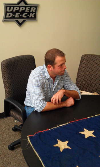 What Upper Deck has done with this collection is both a reflection of this long historical trend and a departure from it. They have assembled a truly impressive and unique set of Civil War memorabilia, especially from the point of view of the average, every day soldier. From the Union side we find buttons, brass cavalry and infantry hat insignias, hammers from rifles, and ambrotypes. Each of these items tells a story – a button with a company letter, a regimental insignia, the face of a young man sent off to war. Most impressive perhaps is the center piece of the collection – a Union Flag actually flown on the field of conflict. This flag bore witness to the very personal experiences of some of the War’s participants. In this way, it reflects the common soldier and all complexity of war. At the same time, the flag bears witness to the values for which those men fought, varied as they were. It reminds us that the War meant something to everyone who participated.