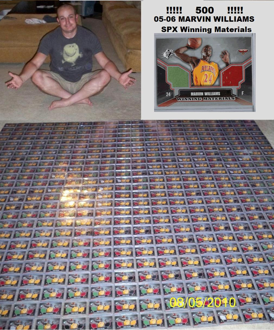 “The first time I saw the 2005-06 SPx Winning Materials cards, I really fell in love with the design. I liked the layout, the use of two jersey swatches and the photo that was used for Marvin was a really cool image of him going up for a dunk. I started with a goal of collecting 24 of the cards hoping to get all the different color jersey combinations I could find. That goal of 24 turned into 50, then 100, then 200, then 250. I wasn’t sure how many were produced so I kept going after more as I found them. Three hundred became, 350, then 400 and I just hit 500 last week. Currently I have 502 of these cards.