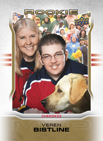 We invited his family and his new best friend Cherokee in for a tour today. Given the competitive nature of our business, normally Upper Deck doesn’t offer tours, but we made an exception for Veren, Verlene and Cherokee. He was excited to see everything that goes into making Upper Deck trading cards, memorabilia and games as he visited today, but by far, the biggest thrill came when we surprised him with his very own trading card with his mom and Cherokee!