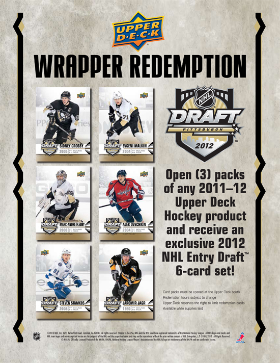 For fans in attendance, we want to encourage all puck fans in attendance to stop by the Upper Deck booth for what should be a memorable experience. For fans who purchase just three (3) packs of any 2011-12 Upper Deck Hockey they can receive an exclusive 2012 NHL Entry Draft 6-card set! Collectors can score these limited cards of top players like Sidney Crosby, Alex Ovechkin, Steven Stamkos, Evgeni Malkin, Marc-Andre Fleury and Jaromir Jagr. Card packs must be opened at the Upper Deck booth and they are available only while supplies last!