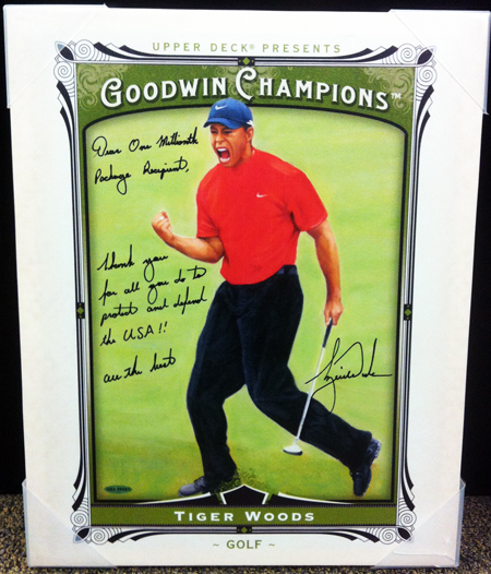 To help commemorate this accomplishment and the organization’s dedication to showing appreciation for U.S. military members, Upper Deck called out some help from the company’s exclusive spokesman; Tiger Woods. At a recent signing session with Upper Deck Authenticated, Tiger Woods signed an item exclusively for the millionth package recipient and added a nice personalized message to go along with it.