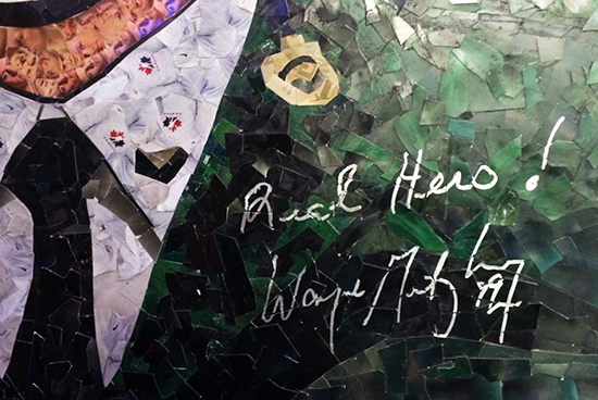On Saturday night Upper Deck hosted a private 25th Anniversary celebration at the Hockey Hall-of-Fame with special guest Wayne Gretzky. We thought it would be powerful to have this hockey icon sign and inscribe the piece in memory of Cpl. Cirillo. The inscription he added to the mosaic says, “Real Hero.”