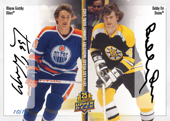 On Tuesday, March 18, Upper Deck has a big promotion designed to say, “thank you,” to shops during the company’s Diamond Dealer meeting. After the company goes through new products and programs with exciting interactive elements where shops can score prizes, every Certified Diamond Dealer in attendance will score a special 25th Anniversary pack. Inside shop owners can find single, dual or even quadruple autograph cards signed from the biggest names in the game who have played such a major role in Upper Deck’s success over the years. Take a look at some of the cards!