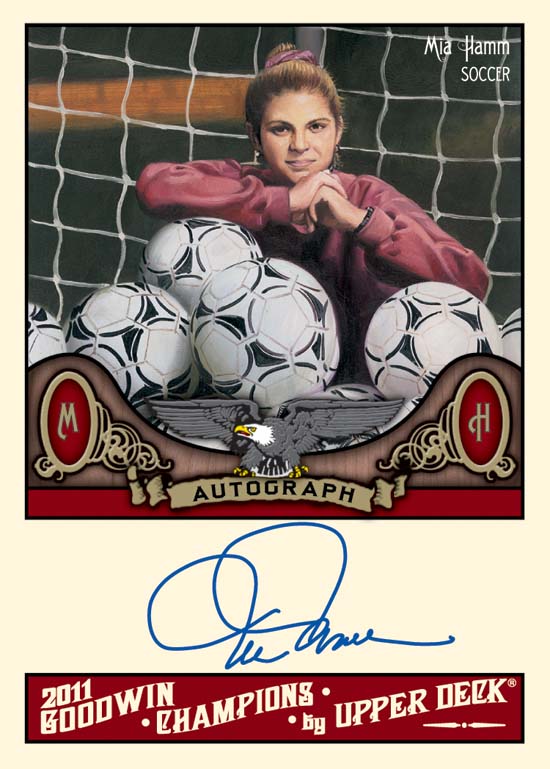 Outstanding best describes the phenomenal lineup of hard-signed autograph cards found inside 2011 Goodwin Champions. A total of 84 sports stars have signature cards including Alex Ovechkin, Annika Sorenstam, Bode Miller, Chris Paul, Nolan Ryan, Bill Walton, Steve Carlton, Carlton Fisk, Candace Parker, David Robinson, Walt Frazier, Greg Louganis, Mia Hamm, Bo Jackson, Johnny Bench, Janet Evans, Jim Rice, Larry Bird, Bubba Watson, Landon Donovan, LeBron James, Johnny Miller, Michael Jordan, Michelle Wie, Mark Spitz, Wayne Gretzky, Ryne Sandberg, Bobby Orr and Tiger Woods. This release marks the first time that both Watson and Wie will have autograph cards appearing in a trading card set.