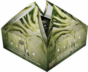 Our most recent release is 2017 Alien, fashioned after the first of Ridley Scott’s Alien film from 1979. This set is printed on vintage-feeling cardstock with images from the film with a 100 card base set and throwback design. Each pack contains 1 card from one of three different Parallel sets, each numbered (Blue to 99, Red to 25, and Canvas to 15). Find and open Alien Egg Shadowbox Cards, Semiotic Patches, and up to Triple Autographs. The box opens from the center of the top and is designed after the Ovomorph.