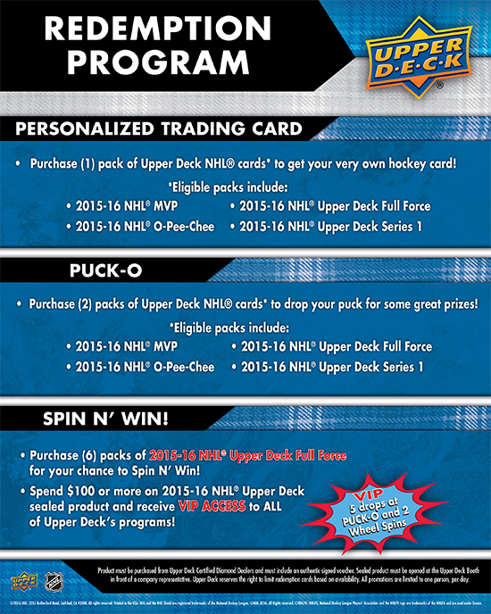 Spin Wheel Wrapper Redemption – Just spin n’ win Upper Deck’s wheel of jersey cards! Fans can bring six (6) sealed packs of 2015-16 NHL® Full Force to the Upper Deck booth to spin the wheel and get a FREE Upper Deck jersey card, autograph card or rare insert card!