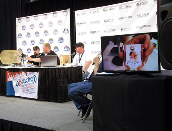 At the National Sports Collectors Convention however, we wanted to expose every day collectors to the fun of group breaks by opening up some product that is truly “exquisite.” On Thursday we did a random draw for fans to appear in the break and you better believe that when Friday came, every single one of them was there with bells on. The reason why was they were getting the opportunity to open two products that the everyday collector rarely gets to open in 2013 Exquisite Collection Football and 2014 Exquisite Collection Golf! Crowds gathered to watch what incredible cards may be discovered and to cheer on their loved ones involved in the break.
