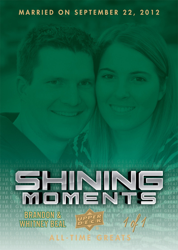 We started interacting with Whitney Beal (@25whitney) awhile ago as she is a big collector and passionate fan of the Tennessee Volunteers. Since Upper Deck is the exclusive home of collegiate products, she obviously has an affinity for our products and loves talking about them on Twitter. In September, 2012 Whitney married her husband Brandon Beal (@hotrod33coupe) and we started thinking about a fun way we could commemorate this shining moment for the couple. And on Valentine’s Day, they found out just what we had in store for them.