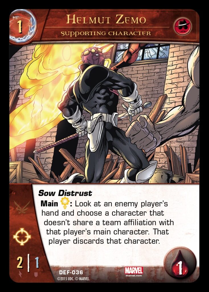 , Helmut Zemo not only gives you a look at your opponent’s hand but you also get to choose a character that doesn’t share a team affiliation with your opponent’s Main Character and your opponent must discard that card.