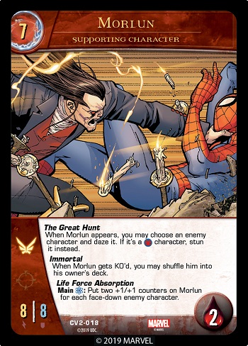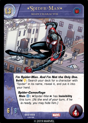 The second thing Spider-Verse means is this: During your Build Phase, if this character is in your hand, you may put it onto your side. (Note: This doesn’t count as recruiting the character.) Putting a second (or third or fourth) main character on your side not only increases your side’s strength, but it will keep you in the game longer since you aren’t knocked out of the game until all main characters on your side are KO’d.