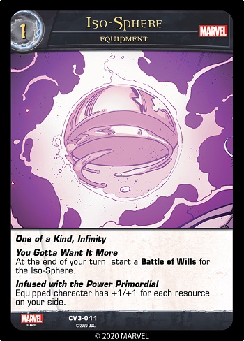 The Iso-Sphere has Infinity, like the Infinity Gems. This means that when it gets put into a KO pile from anywhere, you may shuffle it into its owner’s deck. And it also has Battle of Wills, which represents that the character with the strongest willpower can gain control of it. From the rules: