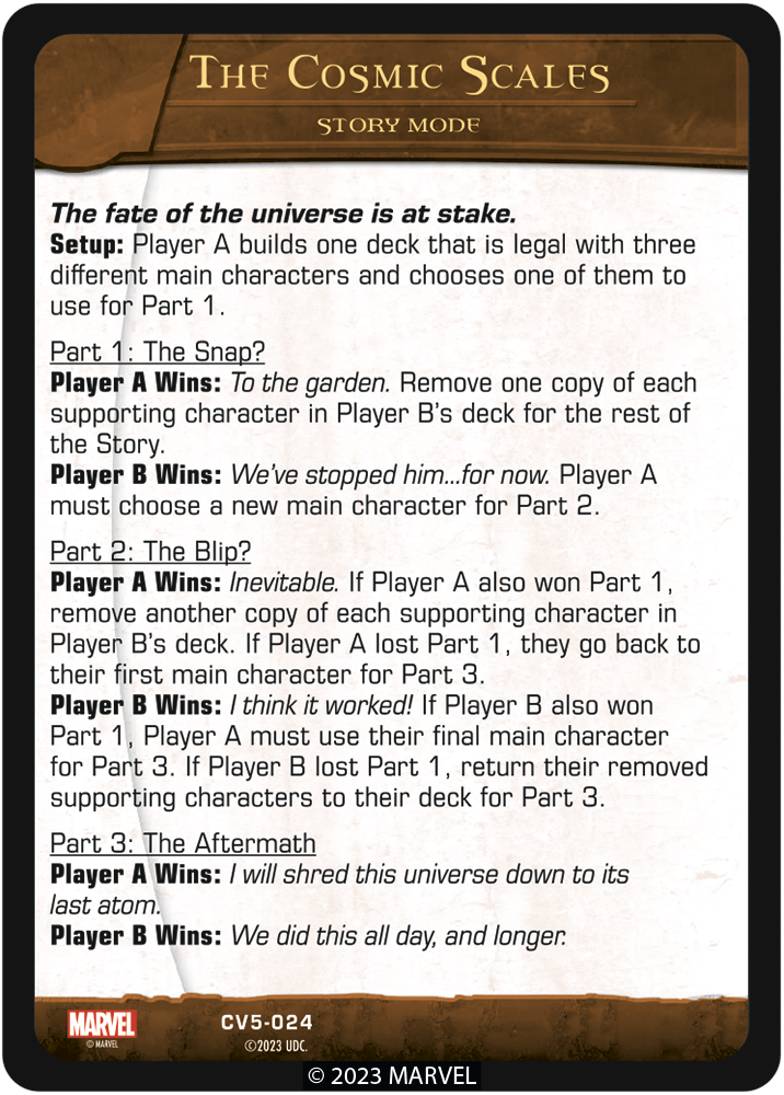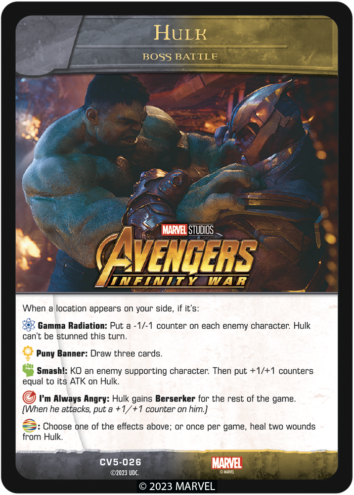 First debuting in Crossover Vol. 3, Boss Battles and Story Mode introduced a fun alternative to playing Vs. System® 2PCG®. These game modes are returning in Crossover Vol. 5 with new MCU-inspired cards that are sure to add a different perspective to the fight! Check out the Hulk Boss Battle and The Cosmic Scales Story Mode cards: