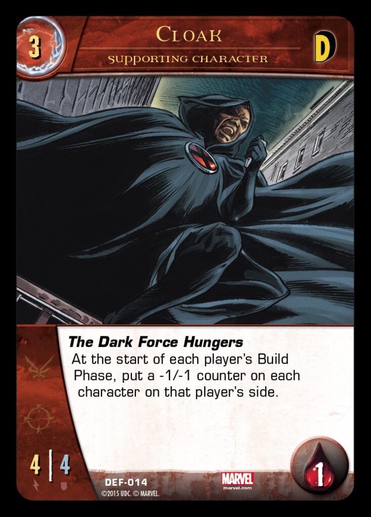 Cloak is a solid 4 ATK and 4 DEF 3-cost supporting character. He can take on many 3-cost characters and even some 4-cost characters without outside assistance. If you can successfully keep him safe, his Keyword Power, The Dark Force Hungers, will begin to drain the life force of your opponent’s team starting on the very next turn. Every character on your opponent’s side will gain a -1/-1 counter at the start of the Build Phase, including your opponent’s Main Character. This is not only a great way to reduce the power your opponent has available to attack you, but any characters with only 1 DEF will automatically stun as soon as they receive the -1/-1 counter. Cloak can be very helpful to ensure you retain board control, making larger threats weaker plus removing smaller threats all by himself.