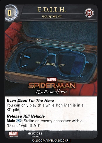 Release Kill Vehicle works like a character on your side with 6 ATK is striking that enemy character. Note: You can play E.D.I.T.H. as long as an Iron Man character is in any KO pile. This includes characters like Tony Stark who have AKA Iron Man.